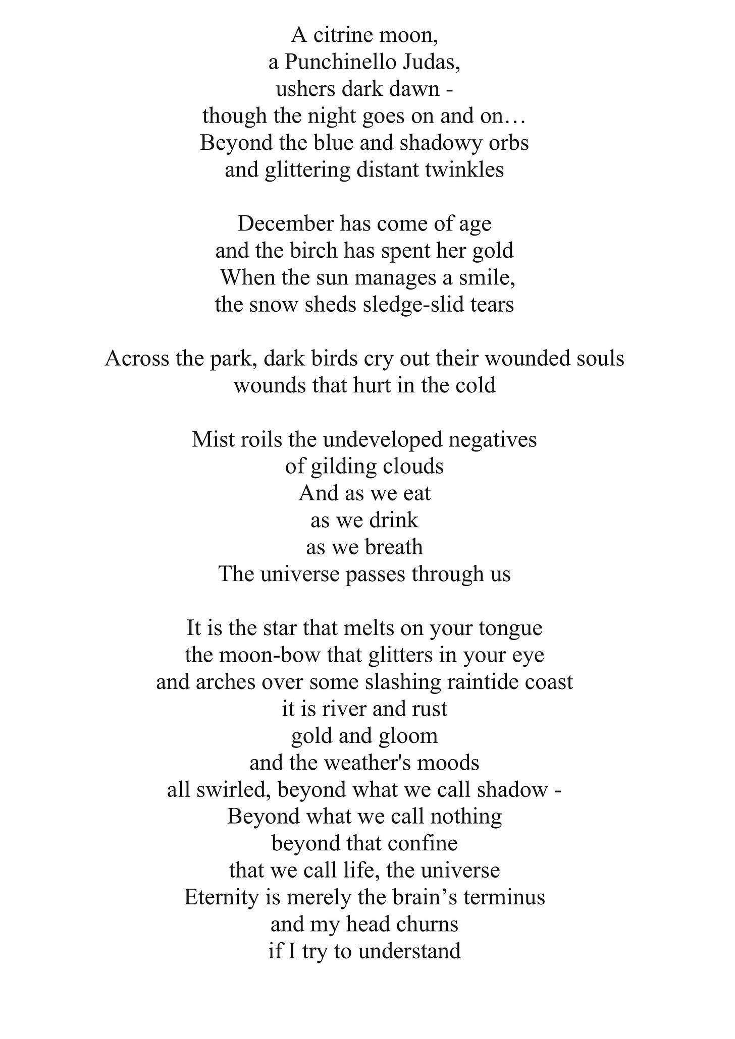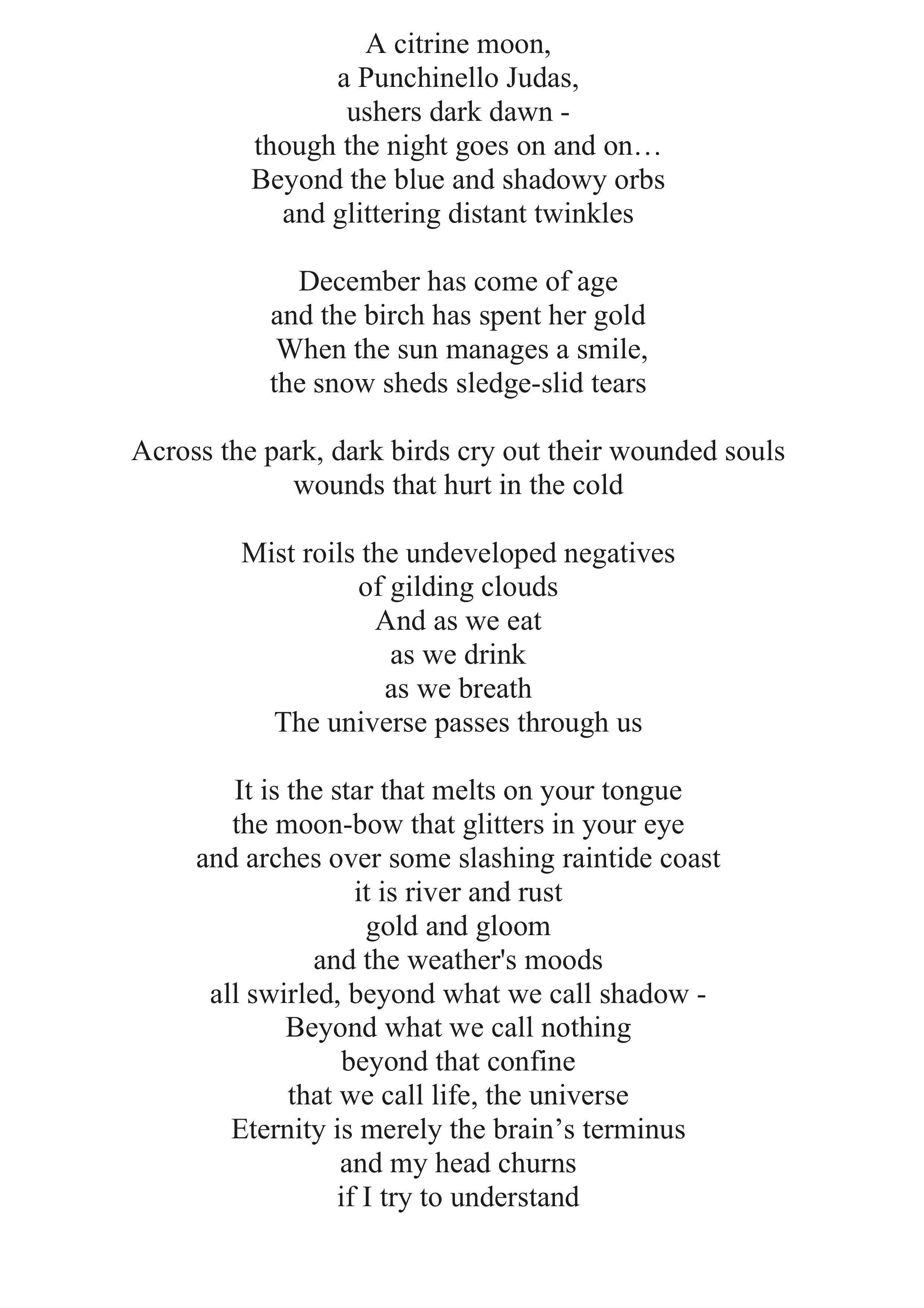 Anyway, I gazed (goze?) past the silver birch whose golden leaves were long since fallen, like dubloons. The sky was a blue grey, and in the middle distance a raven cawed sadly - ordinarily really, its tone seeming to fit the bleak scene. I’d been trying for months to write something about ‘wounded crow’ cos I thought it sounded Duesy, but failed. In the few seconds before I turned the file below into a jpeg (centre align!!!!) I sort of wove it in differently but meaningfully re the wounds, completing a poem I’d been slightly unsure about heretofore. As I goze, thoughts of the solstice crossed my mind and how I like to mark such things, though going out in the cold and/or dark are too rough for me generally.